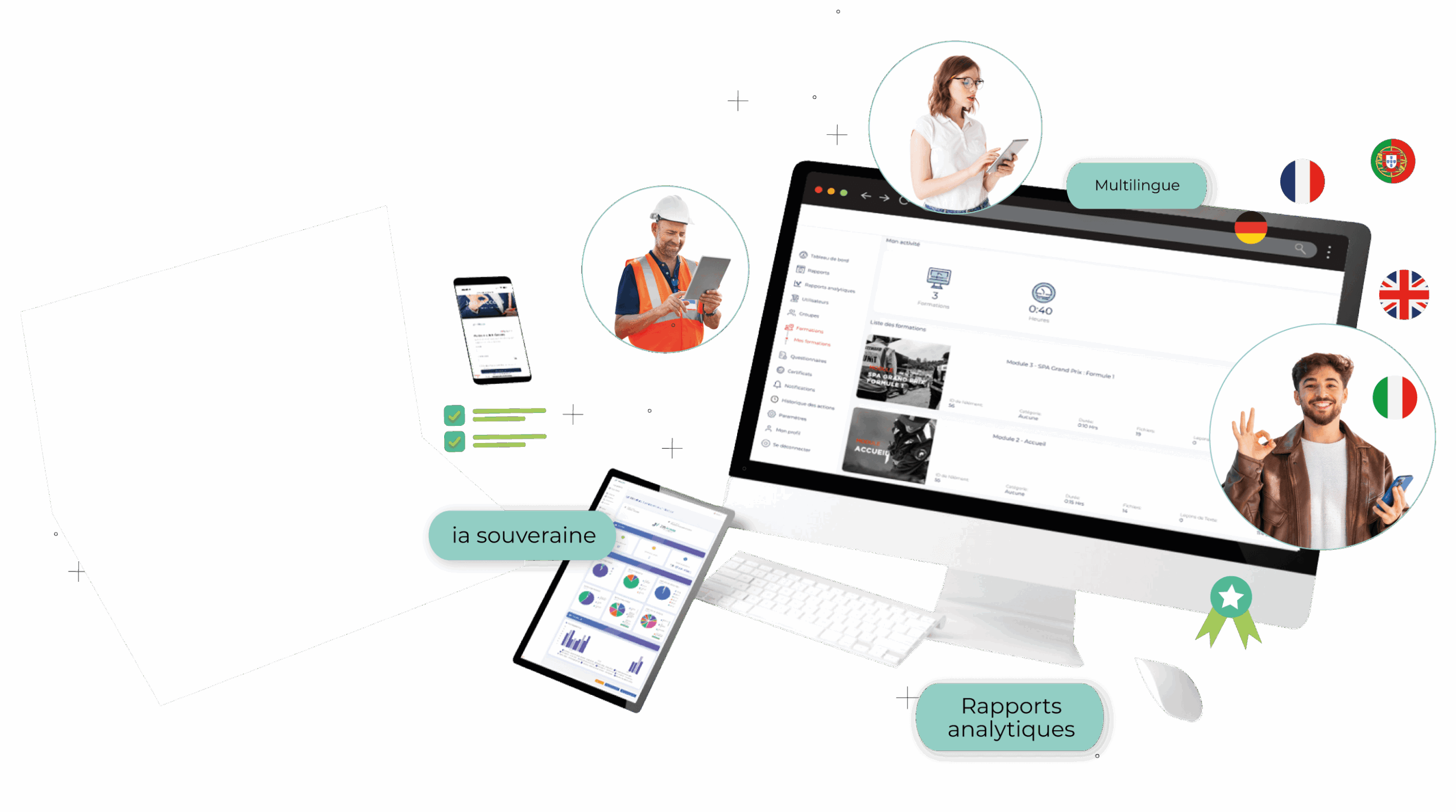 Customized quizzes, automatic certificates with configurable validity, email notifications for administrators and learners.