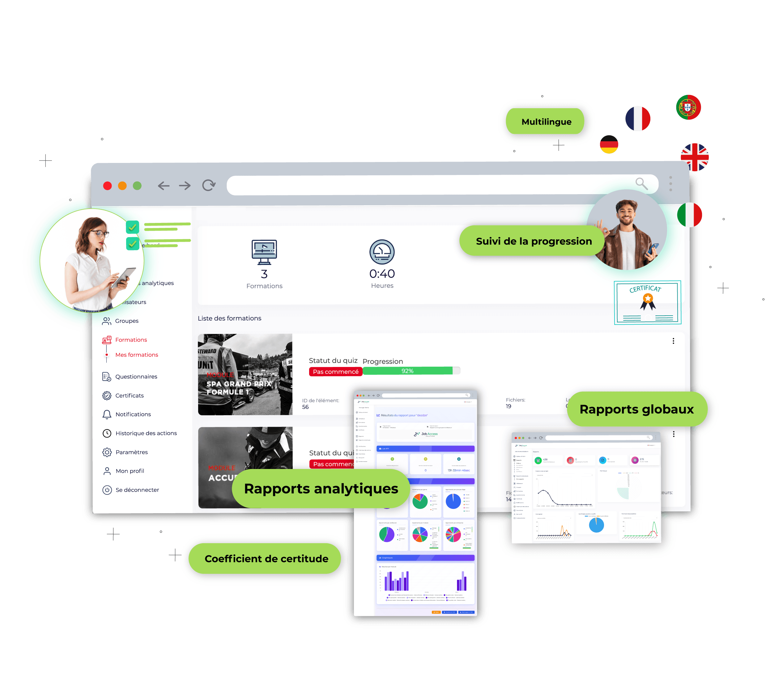 • Rapports sur les formations et les quiz avec taux de complétion et réussite.
